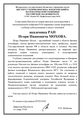 От имени преподавателей и сотрудников Геологического факультета МГУ позвольте передать слова глубокого сочувствия в связи с кончиной широко известного ученого в области физики атмосферы, диагностики и моделирования климатических изменений, авторитетнейшего российского академика Игоря Ивановича Мохова.